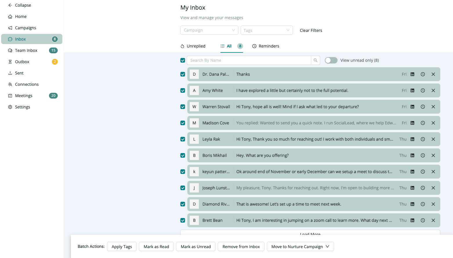 Campaign Filter - Sort messages by the campaign from which the connection originates.